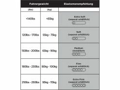 - Cane Creeks Thudbuster Long Travel (LT) Elastomere können einfach per Hand entfernt und getauscht werden. Die Demontage der Stütze ist nicht notwendig. Das Elastomer sollte an dein Fahrergewicht angepasst werden (siehe Elastomerübersicht).