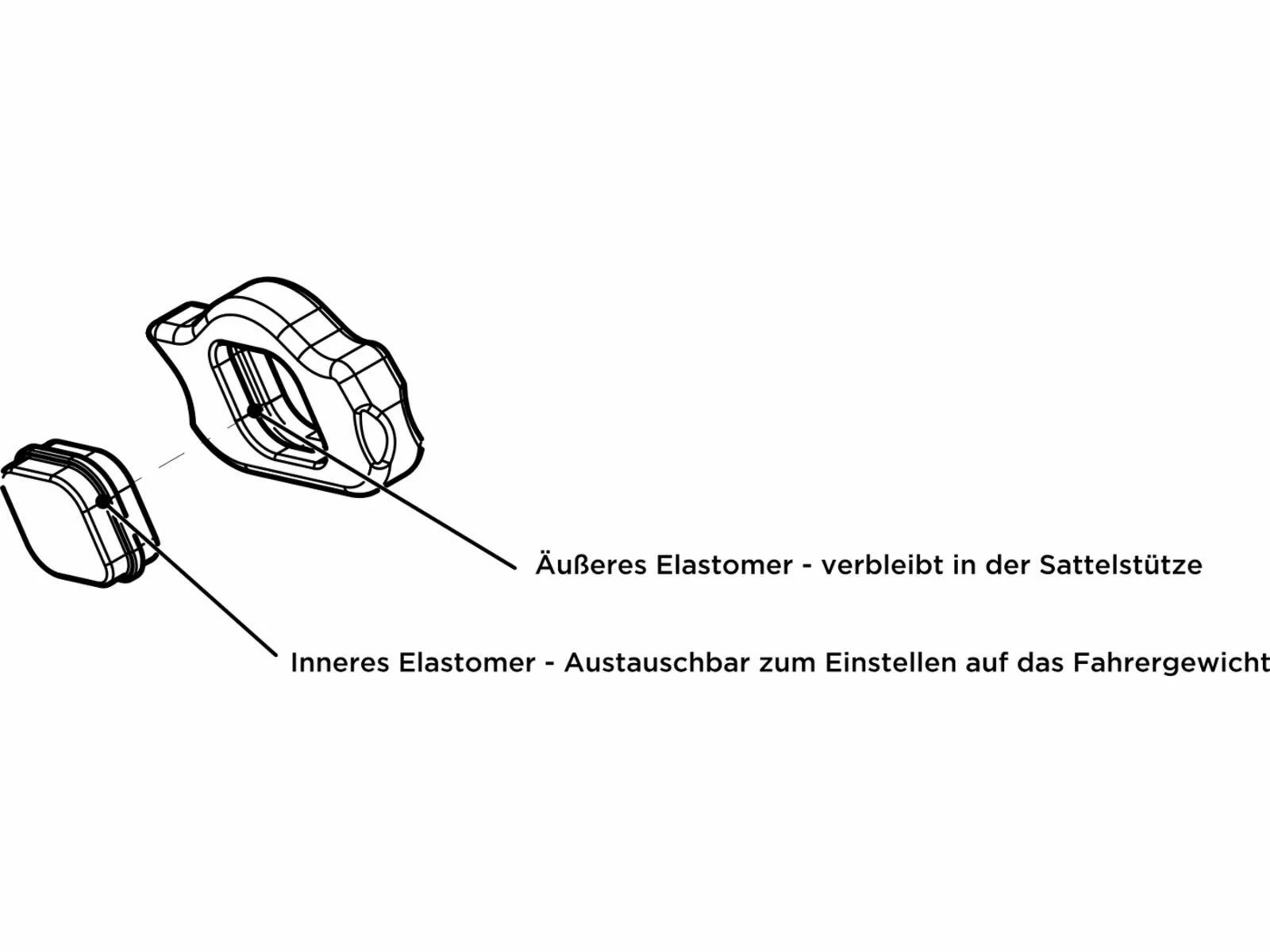 - Die Short Travel Thudbuster Elastomere von Cane Creek bestehen aus einem äußerem und einem inneren Elastomer. Das innere Elastomer kann ohne Demontage der Sattelstütze von Hand entfernt und auf das Fahrergewicht eingestellt werden (siehe Elastomerübersicht). Entferne das innere Elastomer, indem du es waagerecht aus der Stütze drückst.