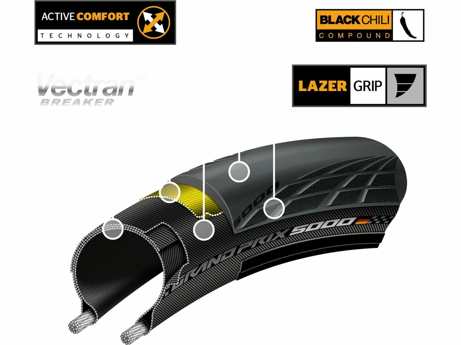 - Grand Prix 5000 vs. Grand Prix 4000 S II: + 12 % besserer Rollwiderstand; + 20 % besserer Pannenschutz; – 10 g leichter (25-622); erhöhter Komfort