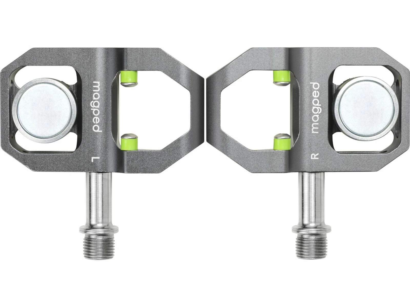 - Sicherheitshinweis: Magped Magnetpedale verfügen über keine feste mechanische Verbindung. Die magnetische Zugkraft wird durch zahlreiche Faktoren wie z.B. Magnetgröße, Verschmutzungen, falsche Positionierung des Schuhs auf dem Pedal und Richtung der Kraftausübung beeinflusst. Ein unbeabsichtigtes Ablösen vom Pedal ist demzufolge jederzeit möglich.