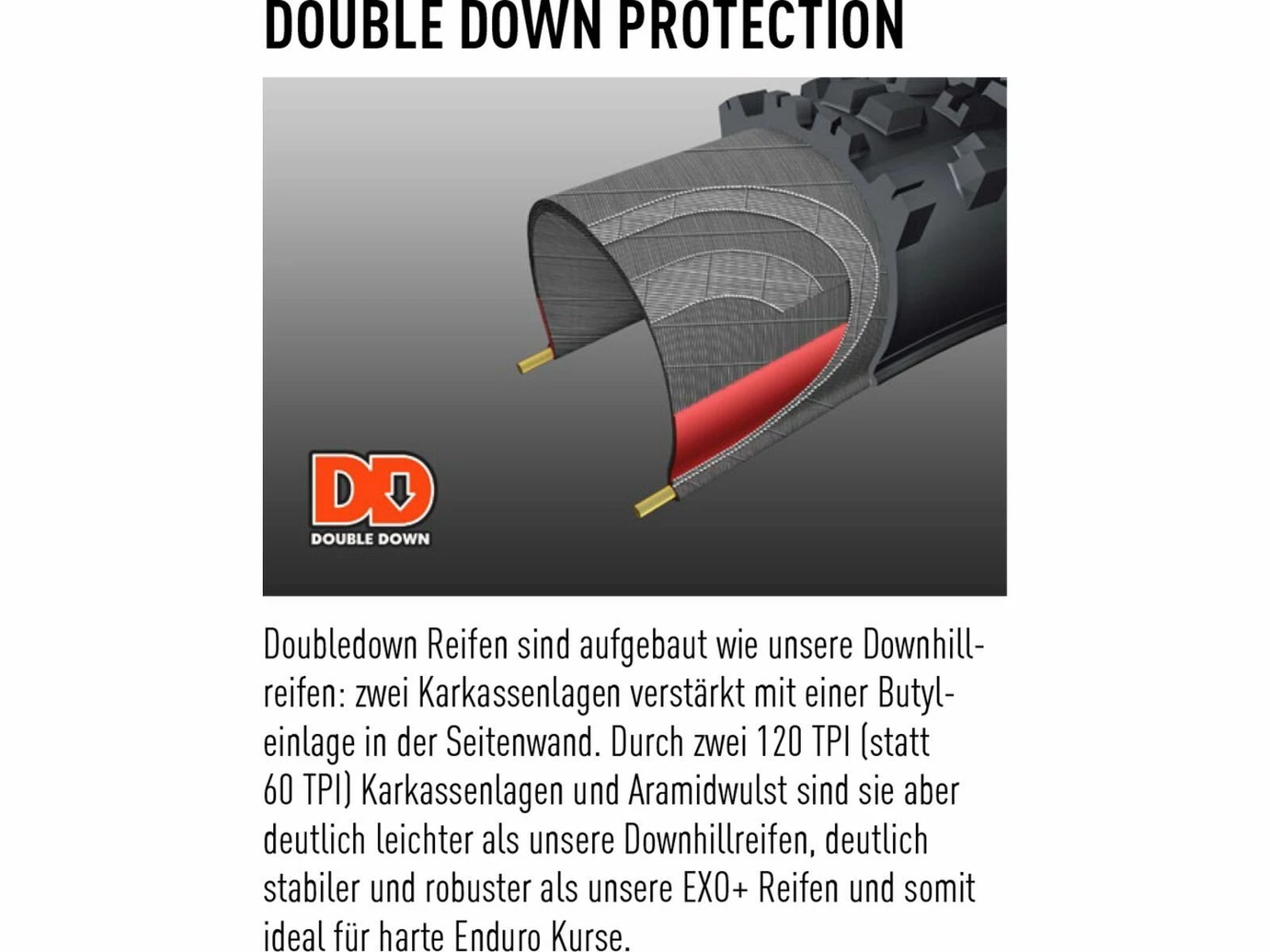 - Double Down Protection: Double Down Reifen sind aufgebaut wie Downhillreifen – zwei Karkassenlagen verstärkt mit einer Butyleinlage in der Seitenwand. Durch zwei 120 TPI (statt 60 TPI) Karkassenlagen und Aramidwulst sind sie aber deutlich leichter als Downhillreifen, deutlich stabiler und robuster als EXO+ Reifen und somit ideal für harte Enduro Kurse.