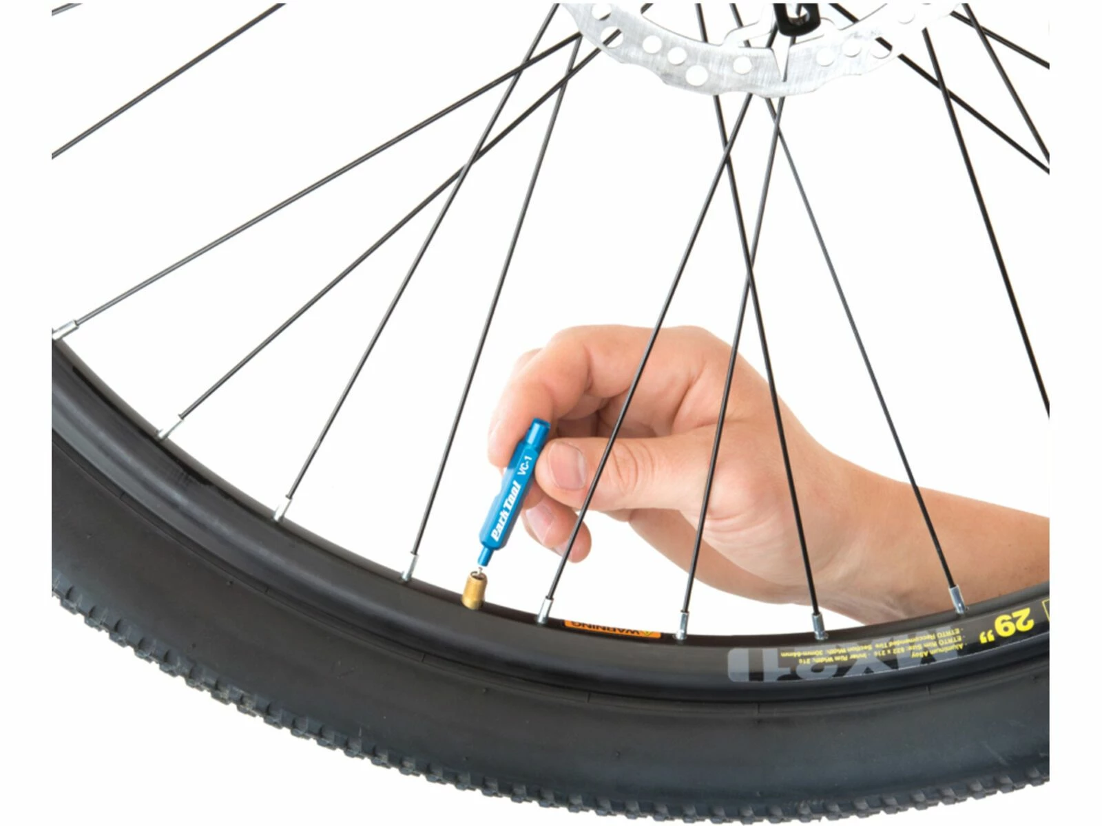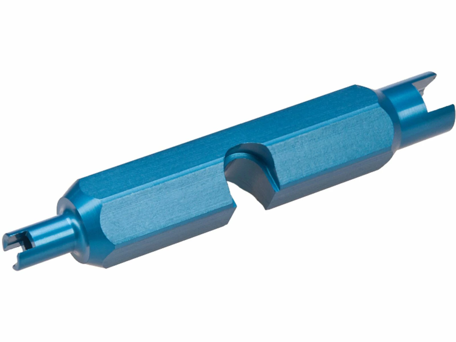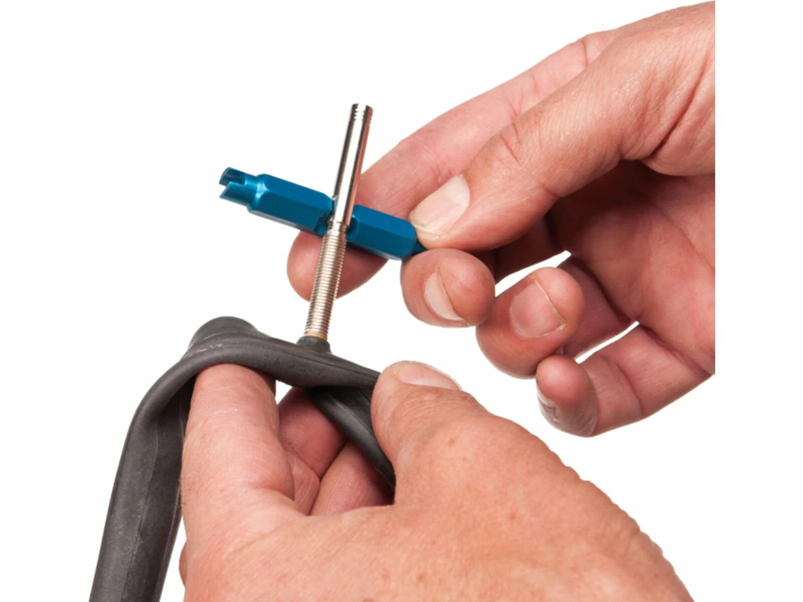 Kleines und praktisches Werkzeug zum Entfernen und Installieren von Ventileinsätzen bei Auto- und Sclaverandventilen sowie von Sclaverandschaftverlängerungen mit 5 mm Schlüsselaufnahme.Herstellerinfo Park Tool