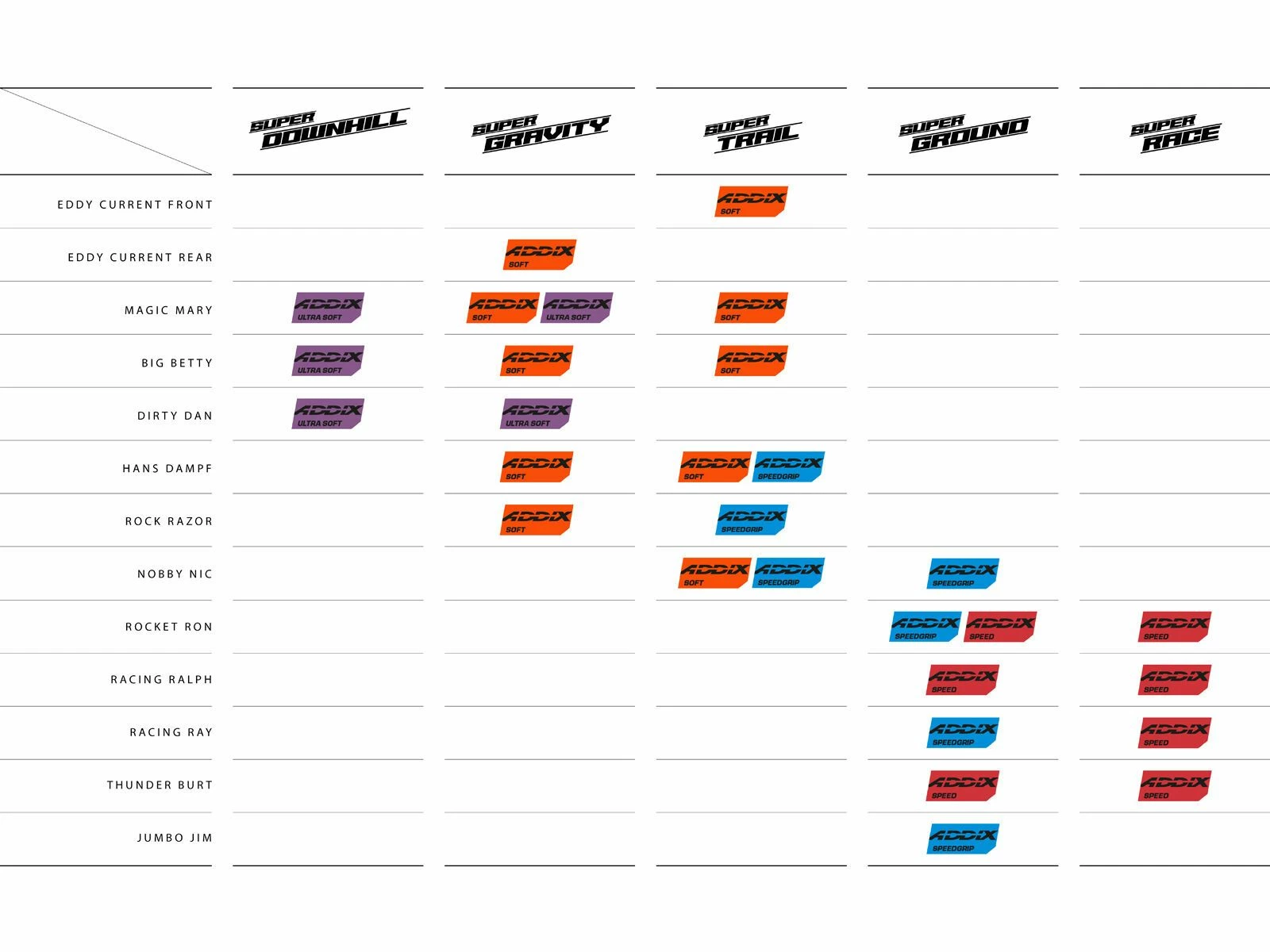 - Addix Soft (orange Kennung): Ein Compound, der eine Brücke über viele Bereiche schlägt. Es gehört in die Enduro- und Downhill-Welt und genauso zu anspruchsvollem All Mountain- und Trailriding. Es glänzt auch in Kombinationen – mehr Speed: vorne Soft, hinten SpeedGrip. Oder mehr Dämpfung: Vorne Ultra Soft, hinten Soft. Rollt klasse und begeistert durch gute Dämpfung. Das ist Addix Soft. Schwalbe hat tief in die Reifenbauer-Trickkiste gegriffen, um beides optimal abzustimmen. Herausgekommen ist ein Compound, das unglaublich viel Spaß macht. Tipp: Addix Soft ist auch ideal fürs E-MTB. Da spielt es seine Stärken „viel Dämpfung und satter Grip“ voll aus, und das wegen der optimierten Kälteeigenschaften das ganze Jahr über!