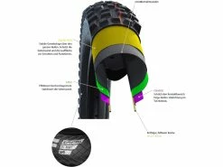 Der Schwalbe Hans Dampf – der Alleskönner für All Mountain und Enduro. Alles was den Spaß am Biken steigert hat Hans Dampf aus der Evolution Line in petto. Für sattes Fahrverhalten und höchsten Pannenschutz auf anspruchsvollen Trails bergauf wie bergab. Die exakte Abstimmung der Stollenposition sorgt für ein kontrolliertes, gutmütiges Fahrverhalten im Grenzbereich. Die Kombination aus großen und kleinen Schulterstollen beschert dem Fahrer optimalen Grip auf einer Vielzahl von Untergründen.Die semi offen angeordnete Blöcke sorgen für optimale Selbstreinigung bei geringem Rollwiderstand.