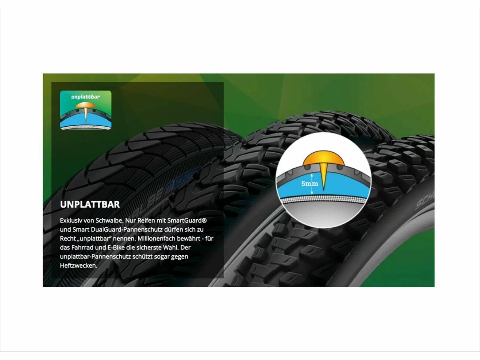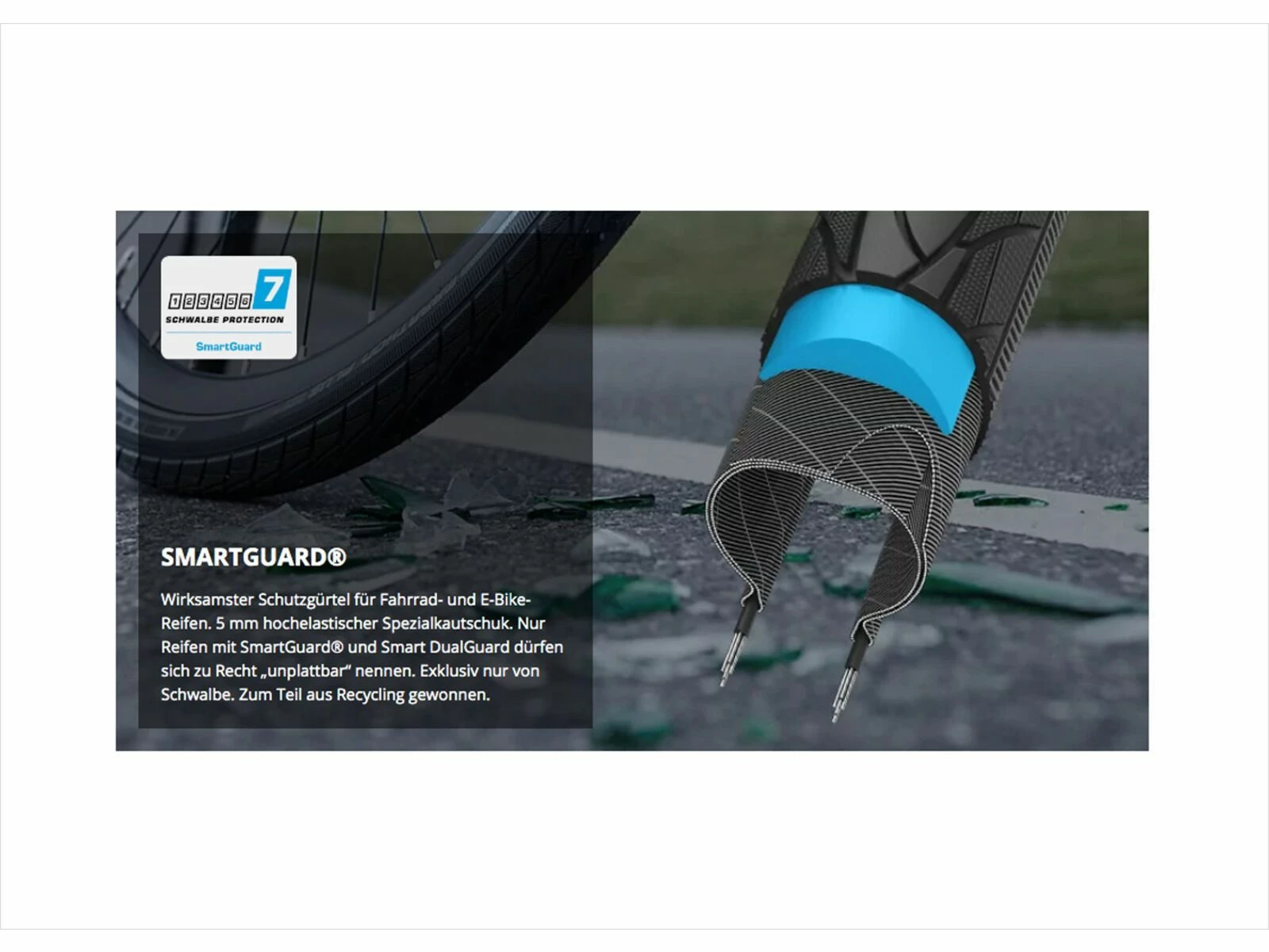 - SmartGuard – unplattbar: wirksamster Schutzgürtel; 5 mm hochelastischer Spezialkautschuk; nur Reifen mit SmartGuard dürfen sich zu Recht „unplattbar“ nennen
