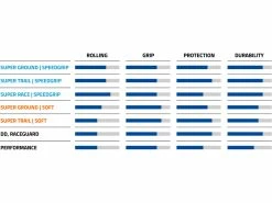 - Super Trail: Eine stabile Karkasse mit zwei Lagen auf der Seitenwand und drei Lagen unter der Lauffläche. Eine umlaufende SnakeSkin Gewebeeinlage über den ganzen Reifen schützt die Seitenwand und die Lauffläche vor Schnitten und Punktionen. Die Apex Ausstattung sorgt zusätzlich für effektiven Durchschlagschutz und stabilisiert die Seitenwand. Eine Chafer-Einlage im Kontaktbereich Felge-Reifen sorgt für die Abdichtung im TLE-Betrieb.