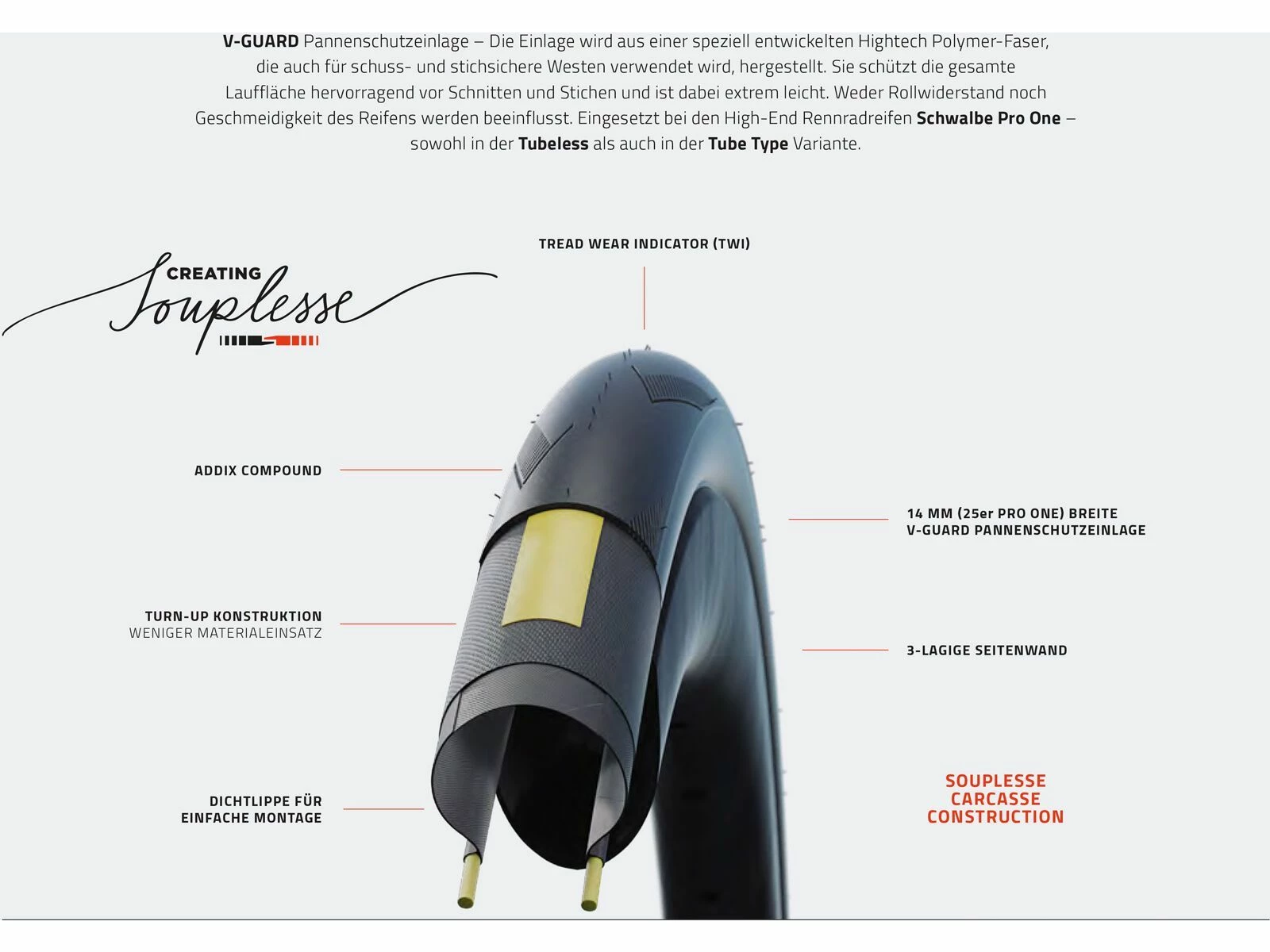Der Schwalbe Pro One der Evolution Line vereint Souplesse, Geschwindigkeit und Kontrolle auf höchstem Niveau. Der beste Rennradreifen, den Schwalbe je entwickelt hat. Der Pro One kommt mit Super Race Karkasse (Souplesse Konstruktion), Addix Race Compound und zusätzlichem V-Guard Pannenschutz.
