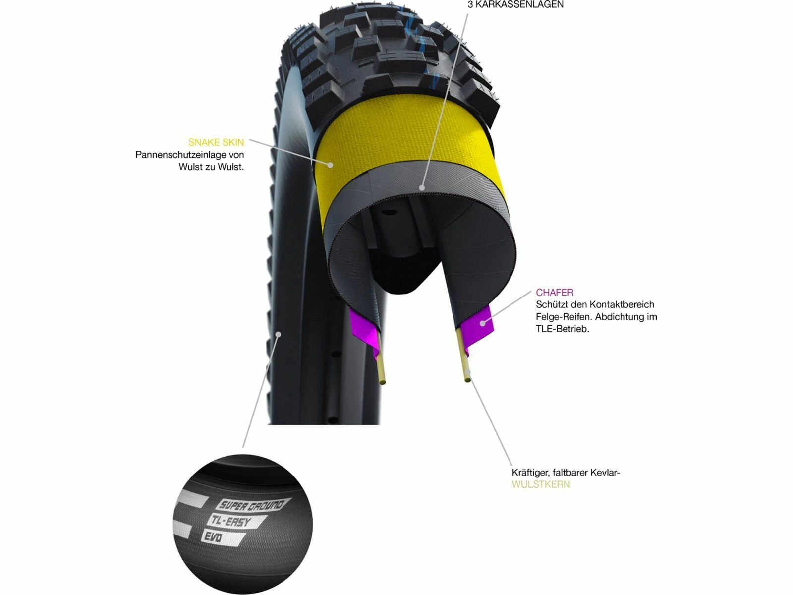 - Super Ground: 3 Karkassenlagen; mit SnakeSkin über den ganzen Reifen und Chafer Einlage (siehe auch Karkasse)