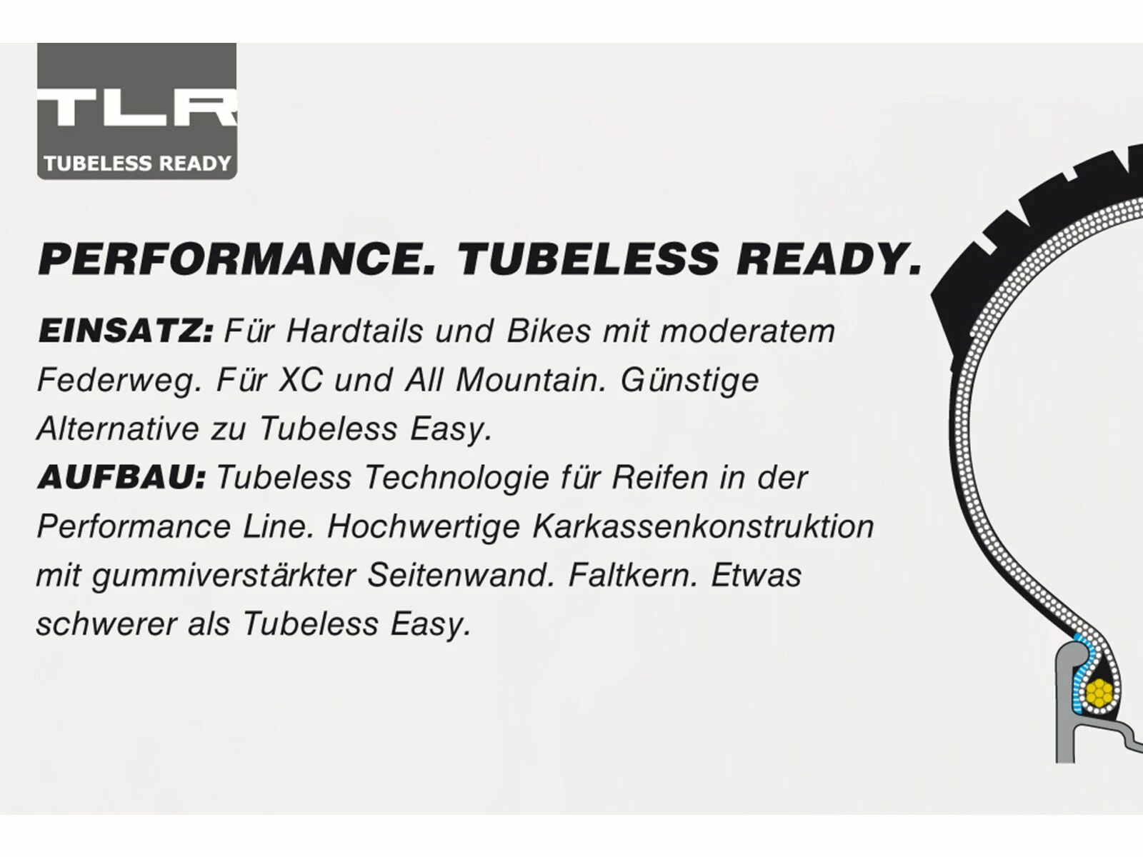 - Tubeless Ready: extrastabiler Reifenkern, mit Gummi verstärkte Seitenwand; für Reifen der Performance Line