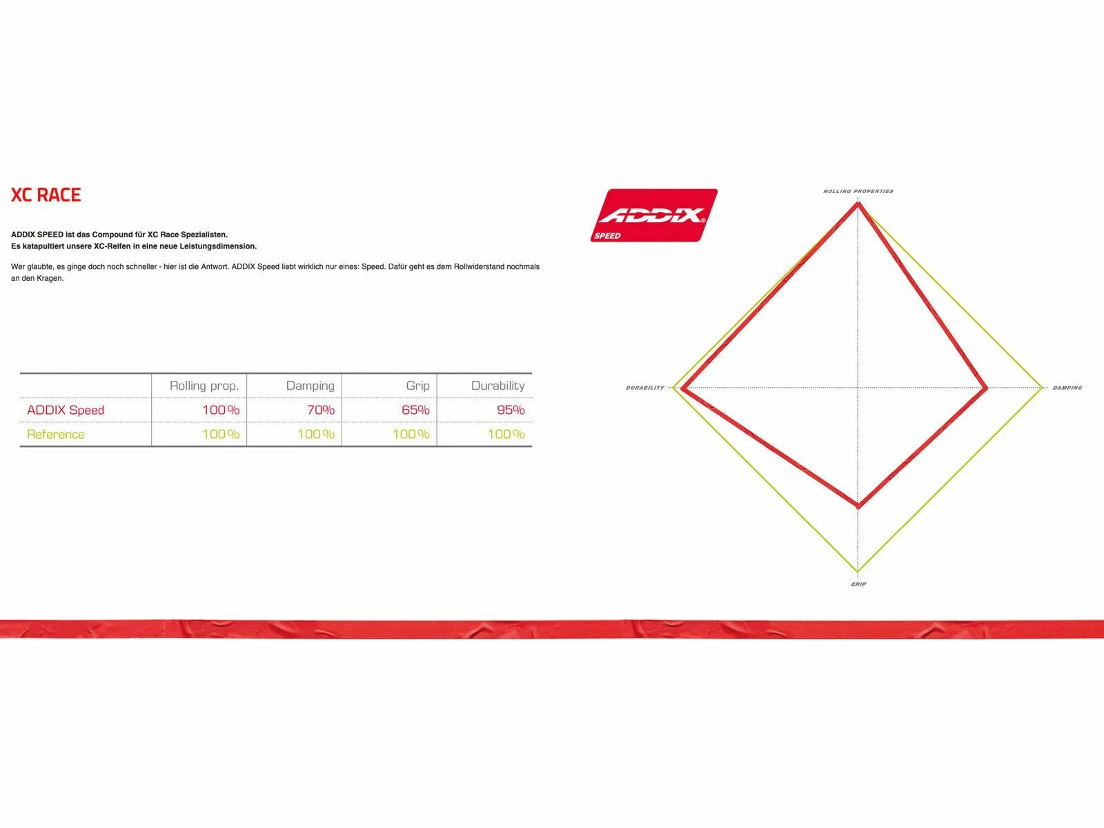 - Addix Speed (roten Kennung): Das Compound für XC Race Spezialisten. Es katapultiert XC-Reifen in eine neue Leistungsdimension. Wer glaubte, es ginge doch noch schneller – hier ist die Antwort. Addix Speed liebt wirklich nur eines: Speed. Dafür geht es dem Rollwiderstand nochmals an den Kragen.
