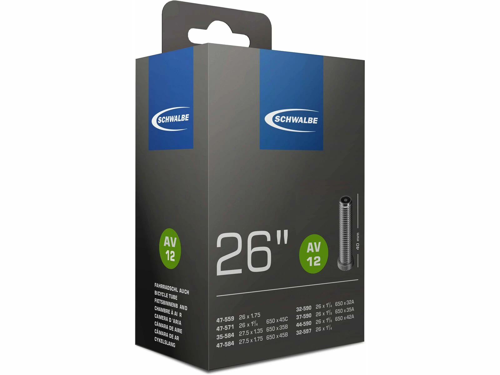 Der Schwalbe Schlauch AV 12 für 26 Zoll oder einige 650B Reifen ist extrem lufthaltig und elastisch und hat gleichmäßige Wandstärken. Das Schraderventil (Autoventil) ist vernickelt und mit einem Gewinde versehen und 40 mm lang. Jeder Schwalbe-Schlauch ist zu 100 Prozent recycelbar. Der AV 12 ist ein Standardschlauch und besteht deshalb schon heute zu rund 20 Prozent aus recyceltem Rohstoff.Features