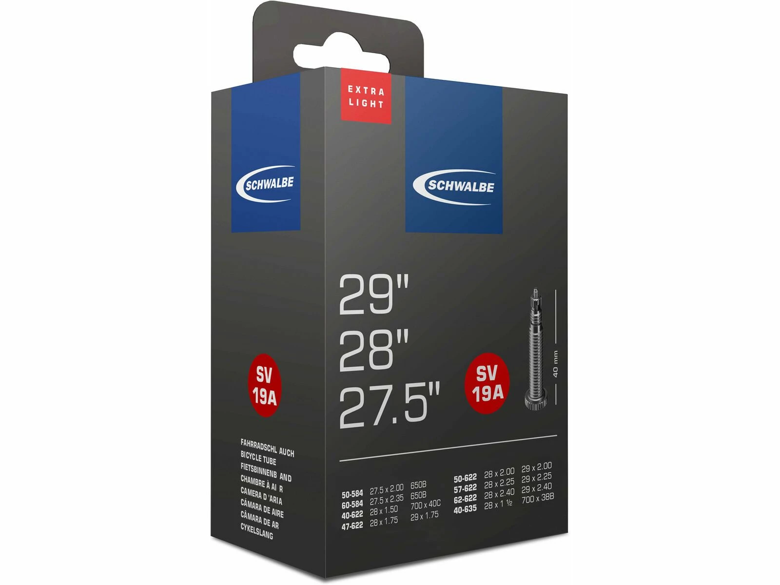 Der Schwalbe Schlauch SV 19A Extra Light für 27.5, 28 und 29 Zoll sowie 650B Reifen ist extrem lufthaltig und elastisch und hat gleichmäßige Wandstärken. Das Sclaverandventil (Presta-Ventil) ist vernickelt und mit einem Gewinde versehen und 40 mm lang. Jeder Schwalbe-Schlauch ist zu 100 Prozent recycelbar. Der SV 19A in der Extra Light-Ausführung bietet dir ein reduziertes Gewicht bei der gleichen Zuverlässigkeit wie die Standard-Ausführung.Features