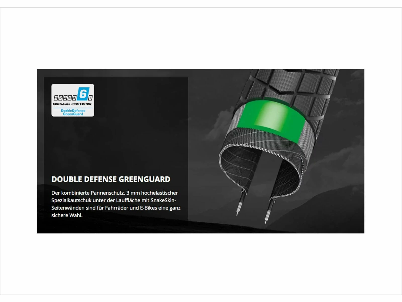 - Double Defence GreenGuard: 3 mm hochelastischer Spezialkautschuk; rundum SnakeSkin-Gewebe (leichte und flexible Gewebelage auf der Seitenwand macht den Reifen unempfindlich gegen seitliche Verletzungen)