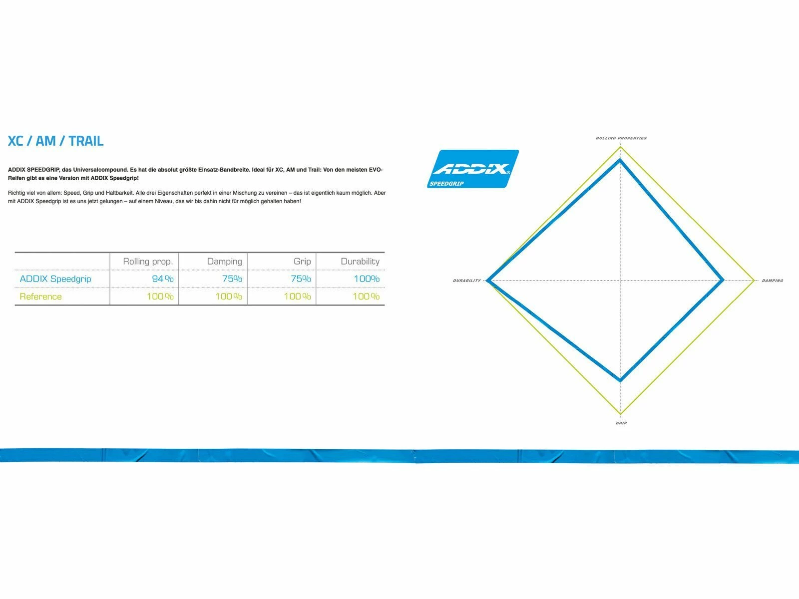 - Addix SpeedGrip (blaue Kennung): Das Universalcompound – er hat die absolut größte Einsatz-Bandbreite. Ideal für XC, All Mountain und Trail: Von den meisten Evo-Reifen gibt es eine Version mit Addix SpeedGrip! Richtig viel von allem: Speed, Grip und Haltbarkeit. Alle drei Eigenschaften perfekt in einer Mischung zu vereinen – das ist eigentlich kaum möglich. Aber mit Addix SpeedGrip ist es uns jetzt gelungen – auf einem Niveau, das man bis dahin nicht für möglich gehalten hat!