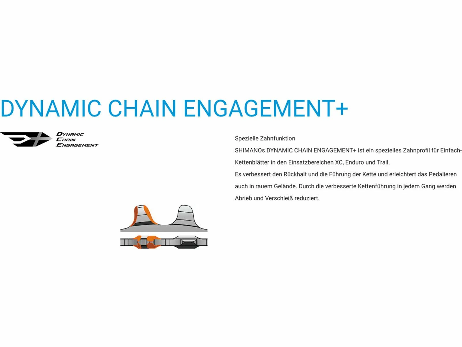 - Dynamic Chain Engagement+: ist ein spezielles Zahnprofil für Einfach-Kettenblätter in den Einsatzbereichen XC, Enduro und Trail; verbessert Rückhalt und Führung der Kette und erleichtert das Pedalieren in rauem Gelände; durch verbesserte Kettenführung in jedem Gang werden Abrieb und Verschleiß reduziert