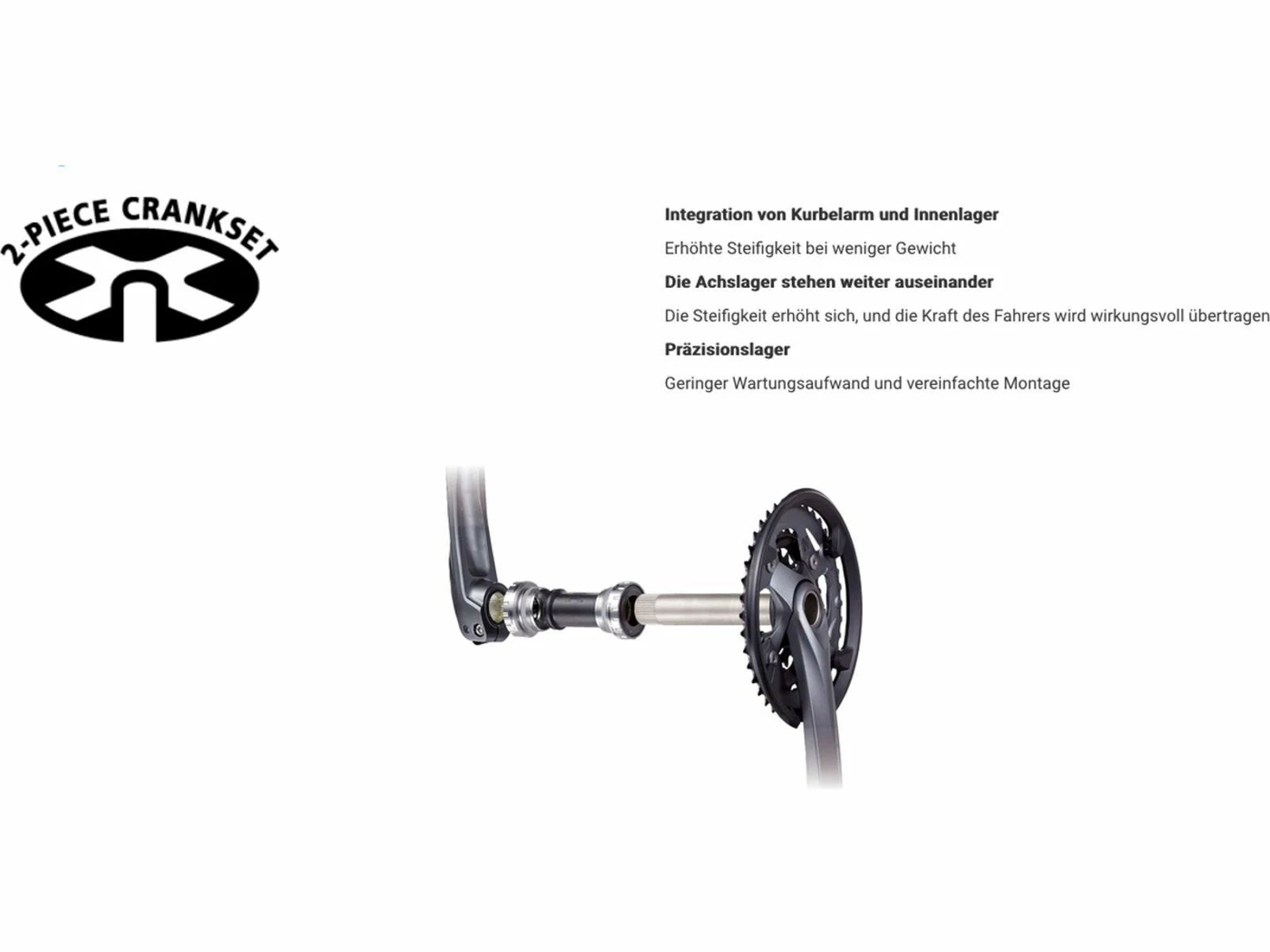 - 2-Piece Crankset: Integration von Kurbelarm und Innenlager: erhöhte Steifigkeit bei weniger Gewicht / Achslager stehen weiter auseinander: Steifigkeit erhöht sich, und die Kraft des Fahrers wird wirkungsvoll übertragen / Präzisionslager: geringer Wartungsaufwand und vereinfachte Montage