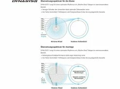 - Dyna-Sys11: Rhythmus und Reichweite – der wahre Vorteil des 11-fach-Antriebs liegt darin, dass die gesamte Übersetzungsbandbreite verfügbar ist, ohne dass der gewohnte Rhythmus aufgegeben werden muss. Dyna-Sys11 sorgt für einen optimalen Rhythmus mit „Rhythm Step“-Gängen im meistverwendeten Bereich. Der Fahrer kontrolliert Trittfrequenz und Energieverbrauch über die eng abgestufte Kassette.