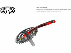 - Hollowglide: Ein hohles großes Kettenblatt. Die extrem steife Hohlstruktur reduziert das Gewicht bei gleicher Festigkeit. Bessere Kraftübertragung und schnelleres, präziseres Schalten vorn.