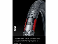 - Grid: noch robusterer Aufbau als Control-Bauweise durch zusätzlichen Schutz an der Seitenwand; hier schützt das Grid-System den Reifen besser gegen Verletzungen durch Steine oder Dornen; ca. 23 % höherer