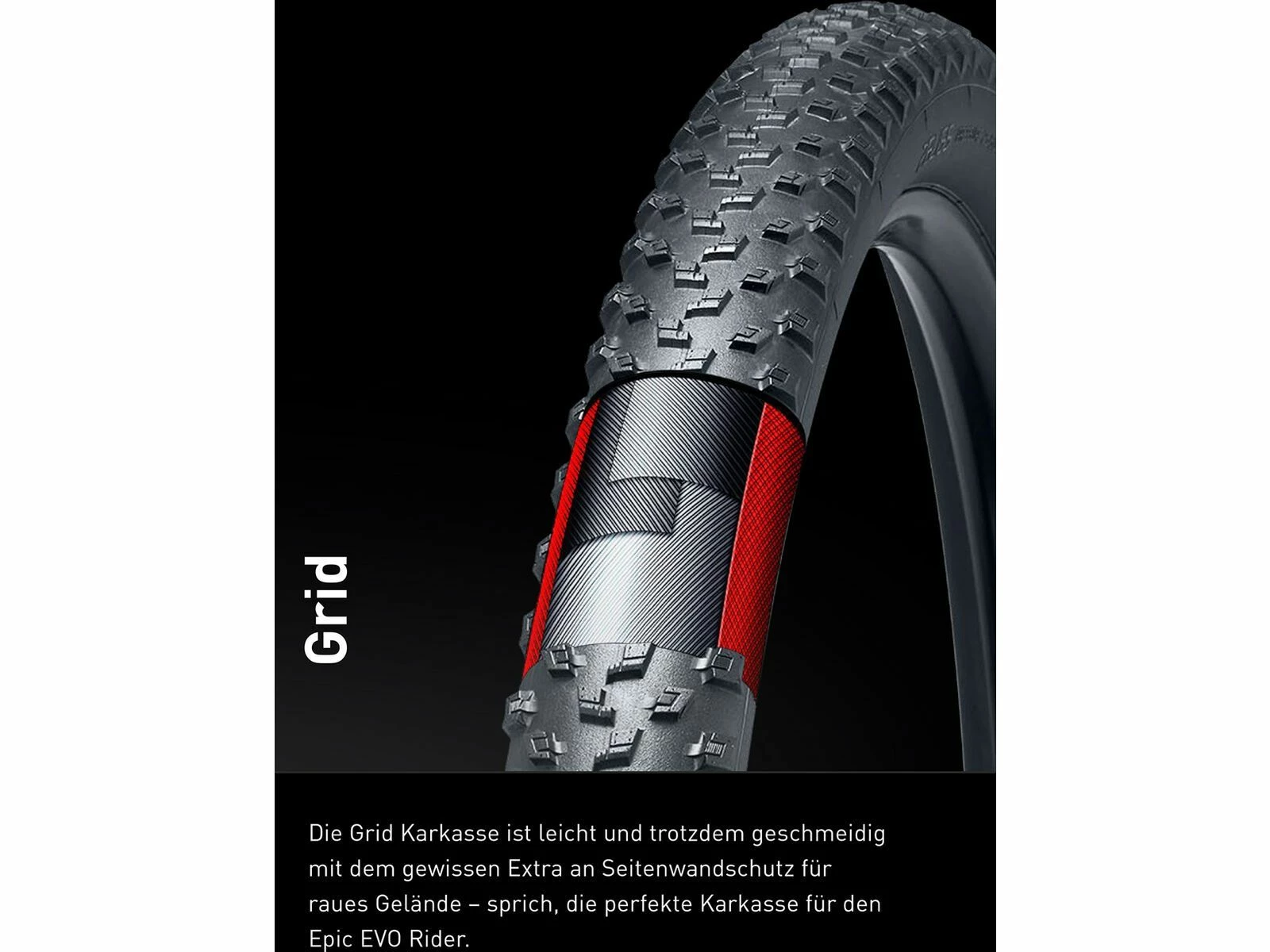 - Die Grid Karkasse ist leicht und trotzdem geschmeidig mit dem gewissen Extra an Seitenwandschutz für raues Gelände – sprich, die perfekte Karkasse für den Epic Evo Rider.