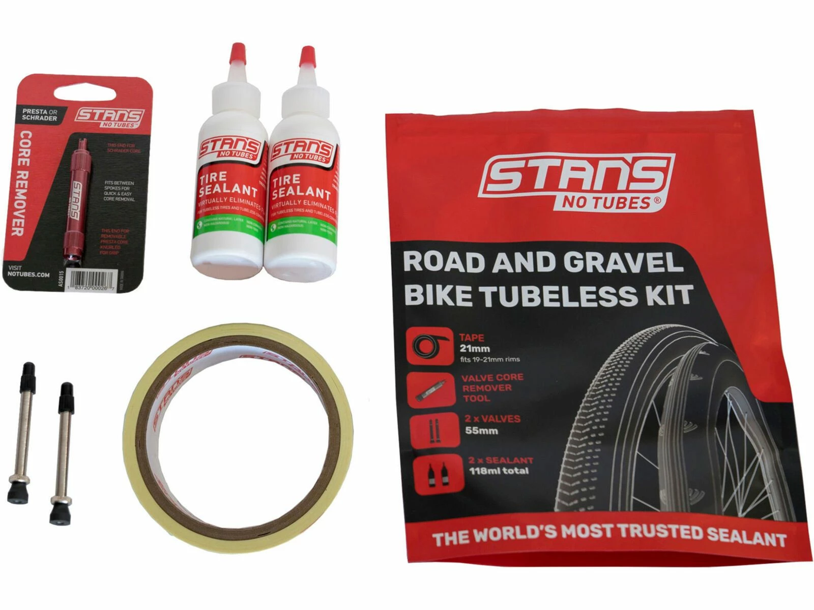 Stan’s NoTubes Road and Gravel Bike Tubeless Kit für 2 Laufräder besteht aus 21 mm breitem Tubeless-Felgenband, zwei 55 mm langen Tubeless-Ventilen, einem Core Remover (Ventilkern-Entferner) und zwei Flaschen mit 59 ml Tire Sealant (Reifendichtmittel).